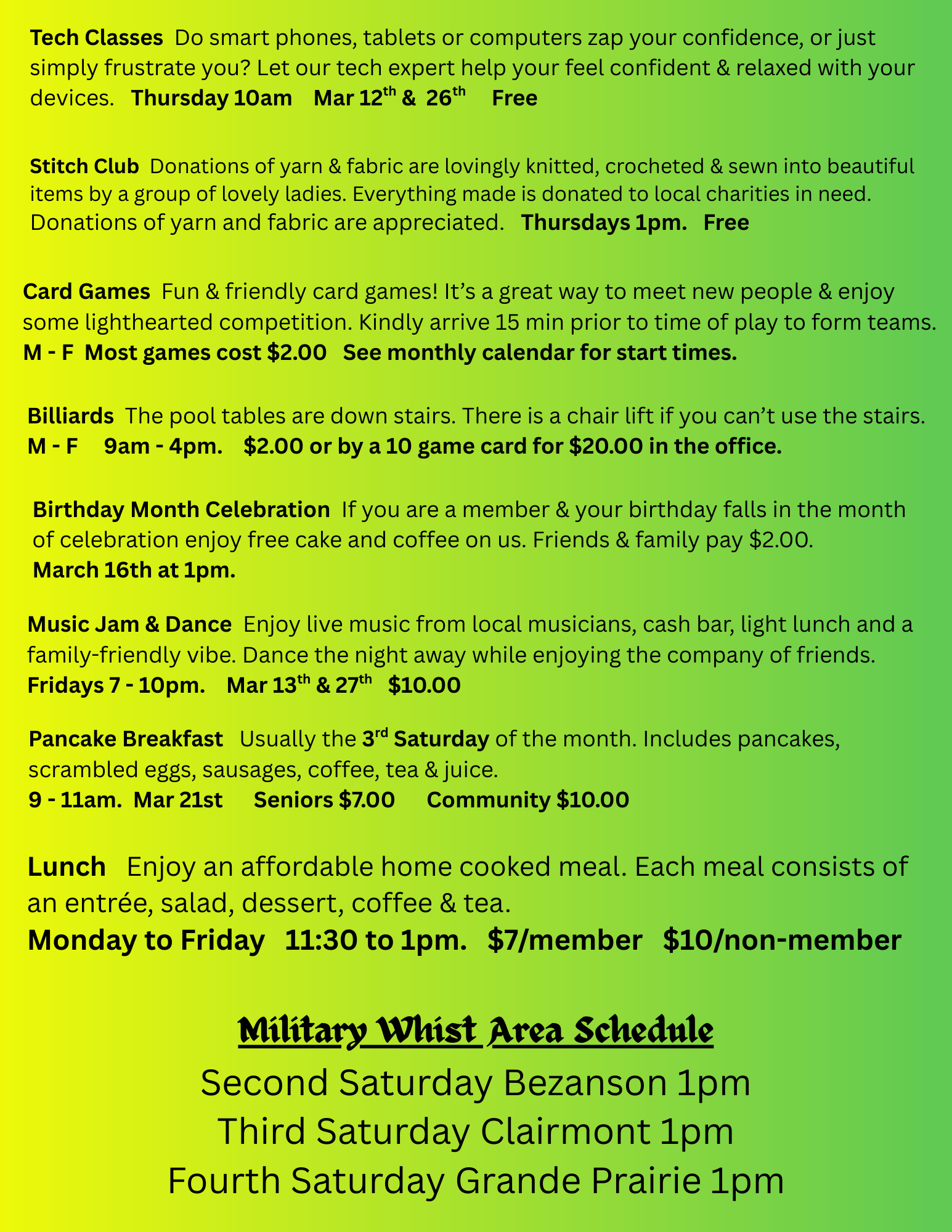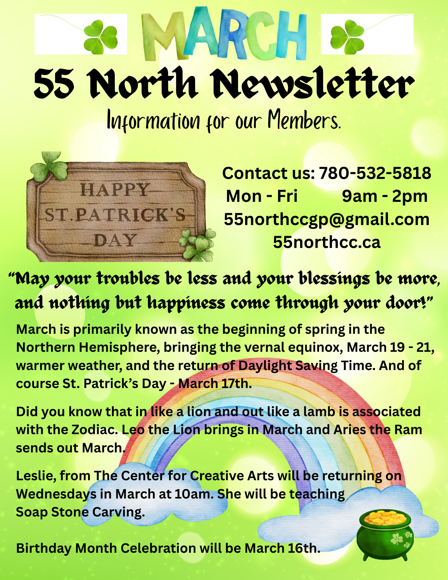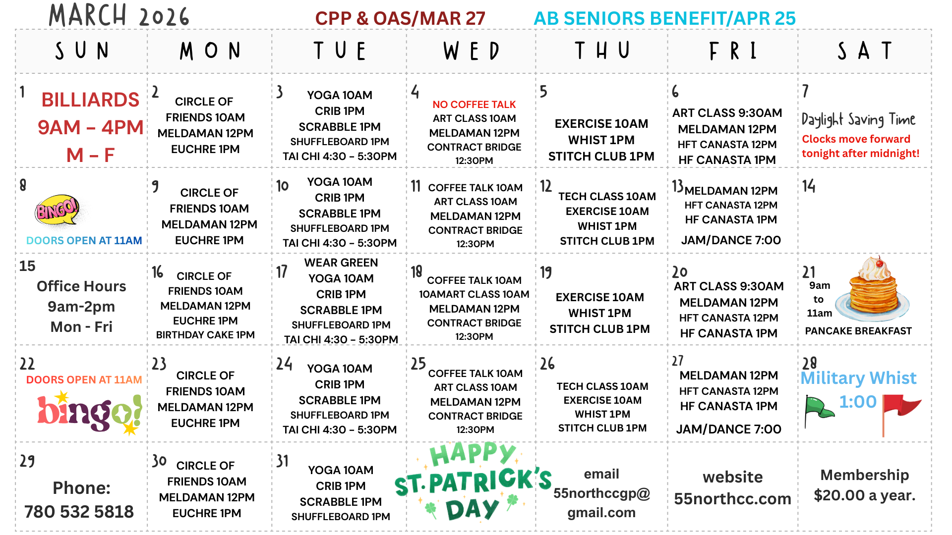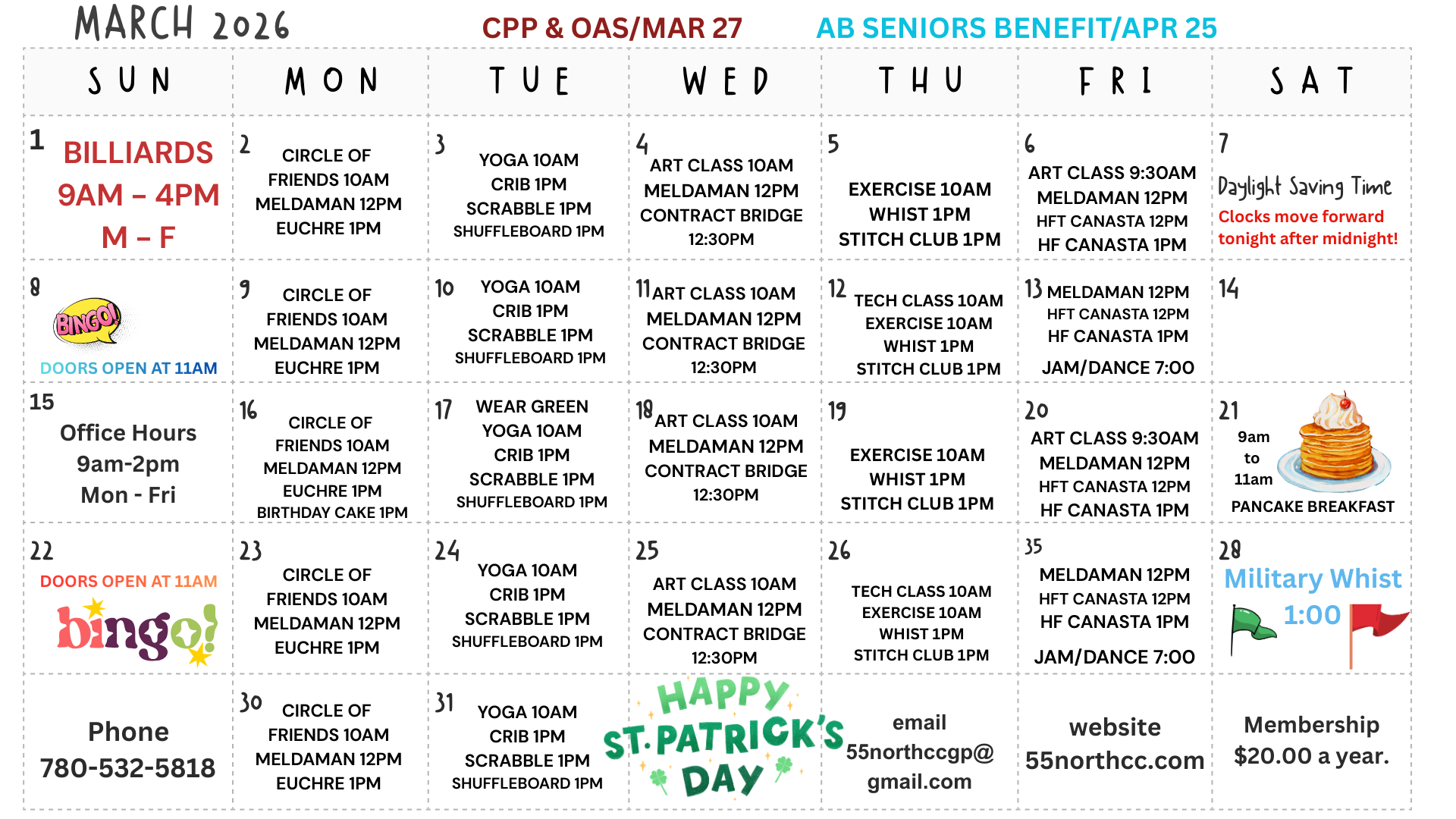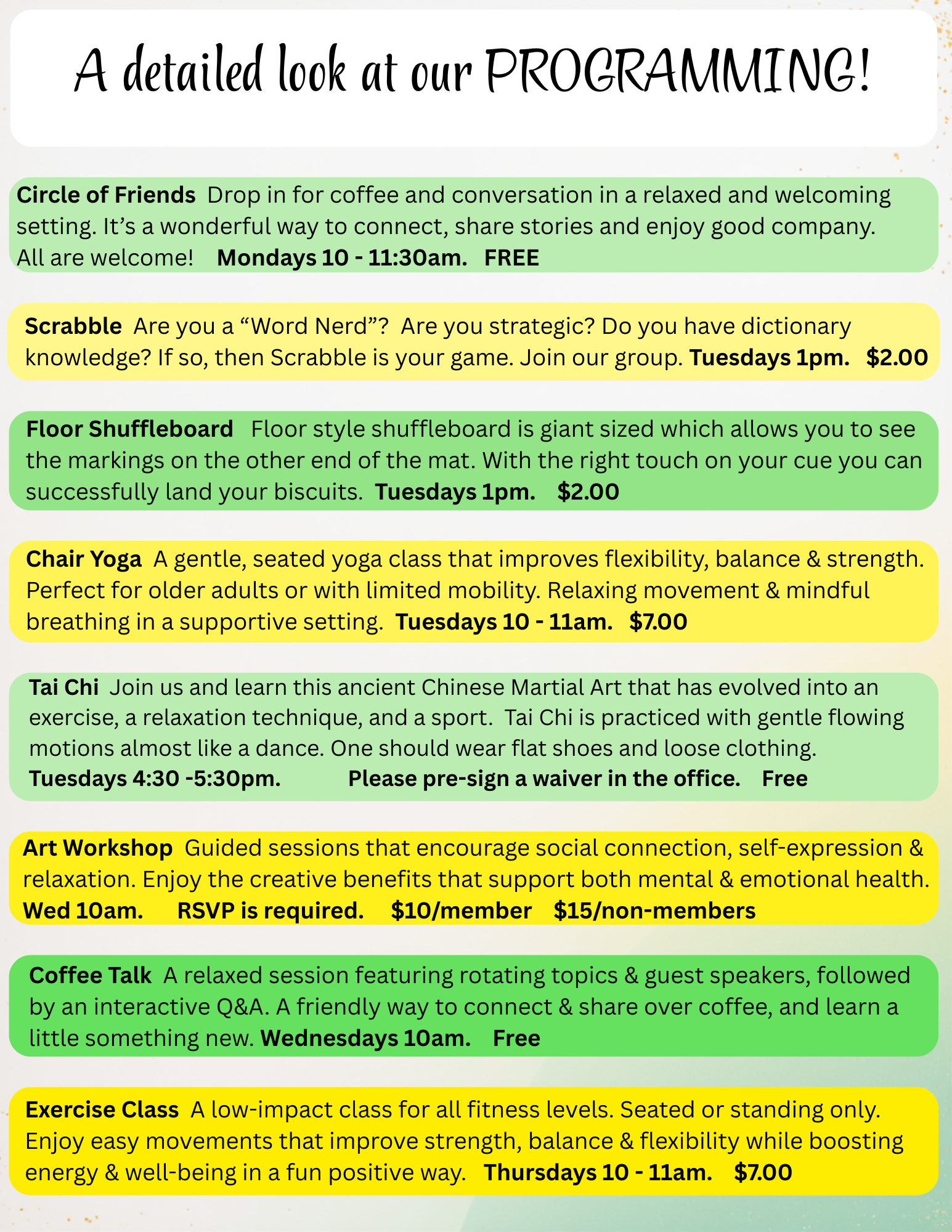 We invite you to become a member and join our friendly, active community. The 55 North Community Centre is a great place to meet new people, enjoy affordable, healthy & tasty meals, and take part in a variety of physical, social, and wellness programs designed to keep you active and connected.